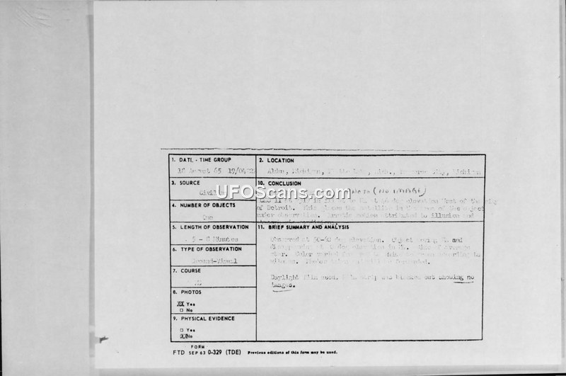 On August 18, 1965, multiple civilians in the vicinity of Alden, Traverse City, and Platte Lake, Michigan, reported observing an unidentified flying object. The reports were received by the local police department and subsequently referred to the Air Force. TSgt David N. Moody and Major Frank D. Bingham of Empire AFS conducted an investigation into the sightings. Witnesses, including a student, a sheriff's deputy, and a state trooper, described a round object, approximately the size of an average star, which changed colors from red to white to green. The object was observed at an altitude of 50 to 60 degrees above the horizon and exhibited movement ranging from stationary to steady travel in a northeast direction. The duration of the observation was reported as 5 to 8 minutes. One witness captured the object on film using an 8mm Bell & Howell camera with an F1.8 lens and a haze filter, utilizing Kodachrome II daylight film. Approximately 20 feet of undeveloped film was forwarded to the 26th ADIV for analysis. Empire AFS reported no radar contact regarding the object. Following an investigation and coordination with AFSC (FTD), Major Bingham concluded that the object was the Echo II satellite, which was noted to be west of Detroit at 1119 hours on the same date, heading northeast. The report was submitted in accordance with AFR 200-2.