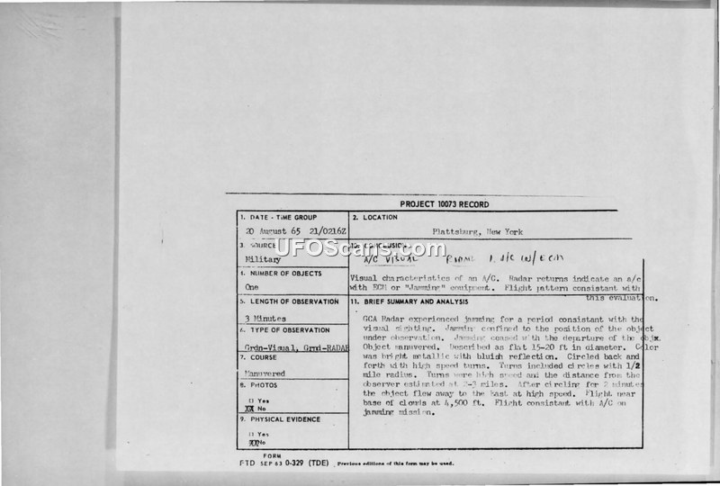 Project 10073 Record: UFO Sighting, 20 August 1965
