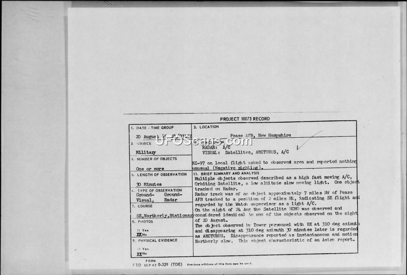 This report documents a UFO sighting at Pease AFB in August 1965, which was officially attributed to the Echo Satellite and a light aircraft. The investigation highlights the role of atmospheric conditions in creating anomalous radar returns.