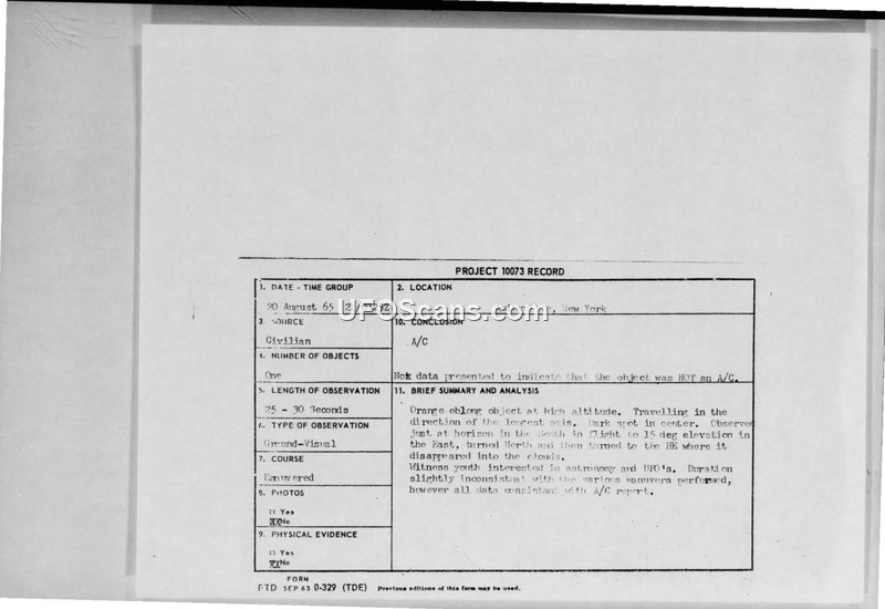 Project 10073 Record — Amityville, New York, 20 August 1965
