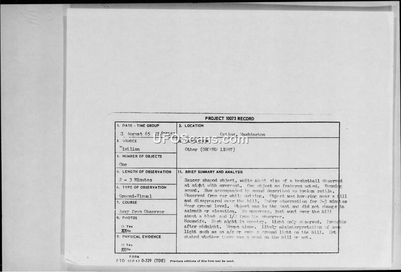 Project 10073 Record — Sighting near Orting, Washington, 21 August 1965