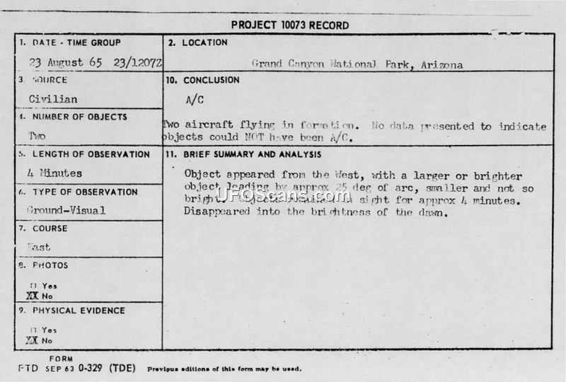 A civilian reported two unidentified objects over the Grand Canyon on August 23, 1965. The Air Force investigated the report and concluded the objects were likely satellites, space debris, or high-flying aircraft.
