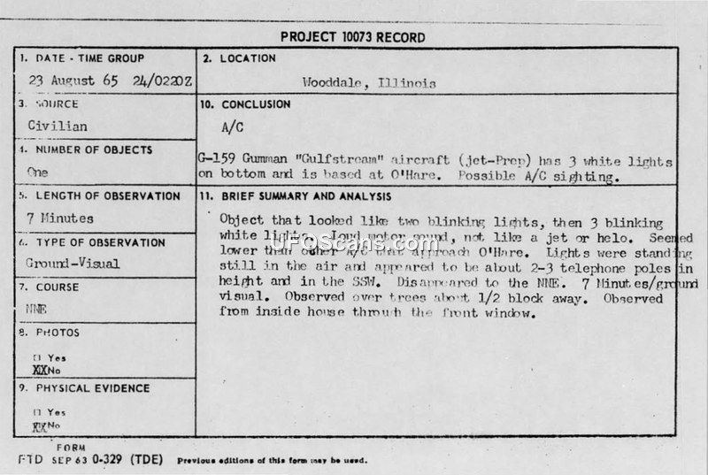 A civilian reported a stationary object with blinking lights and a loud motor sound in Wooddale, Illinois, on 23 August 1965. The Air Force concluded the sighting was a Grumman G-159 Gulfstream aircraft landing at O'Hare.