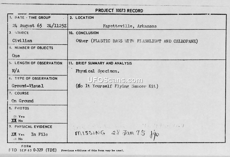 An investigation into a UFO sighting in Fayetteville, Arkansas, identified the object as a homemade 'Flying Saucer Kit' constructed from plastic bags, a battery, and a flashlight bulb. The Air Force concluded the object was likely a prank or amateur meteorological device.