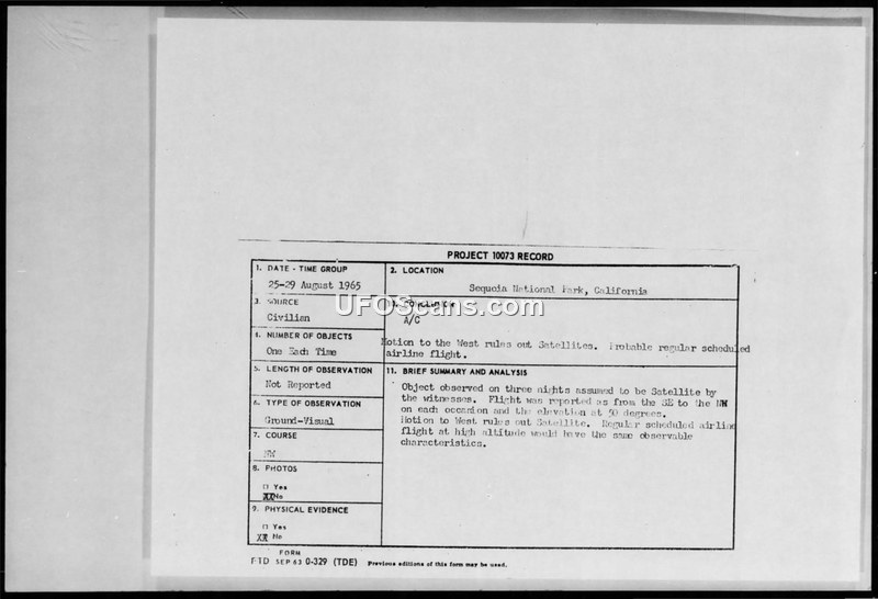 A high school student reported a UFO sighting in Sequoia National Park in August 1965. The Air Force investigated the report and concluded the object was a high-altitude aircraft rather than a satellite, citing the object's westward flight path.