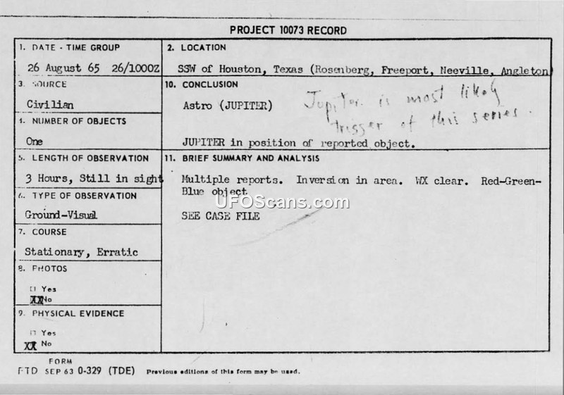 Project 10073 Record: Sighting Report - Houston, Texas, 26 August 1965