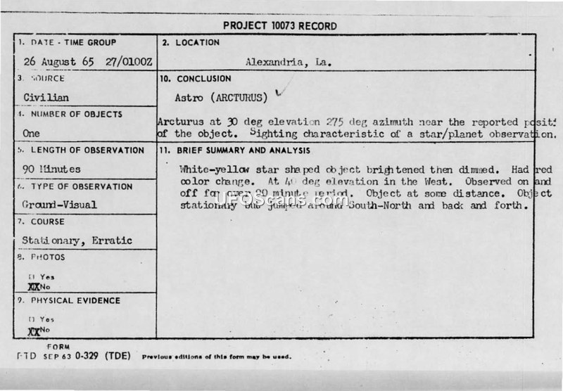 A 1965 sighting report from Alexandria, Louisiana, involving two civilian witnesses who observed an erratic, star-like object for 90 minutes. The USAF investigation concluded the object was likely the star Arcturus.
