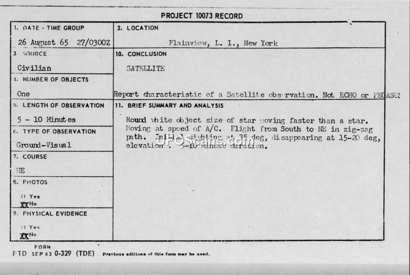 A 1965 UFO sighting in Plainview, New York, was investigated by the Air Force under Project 10073. The object was officially identified as a satellite.
