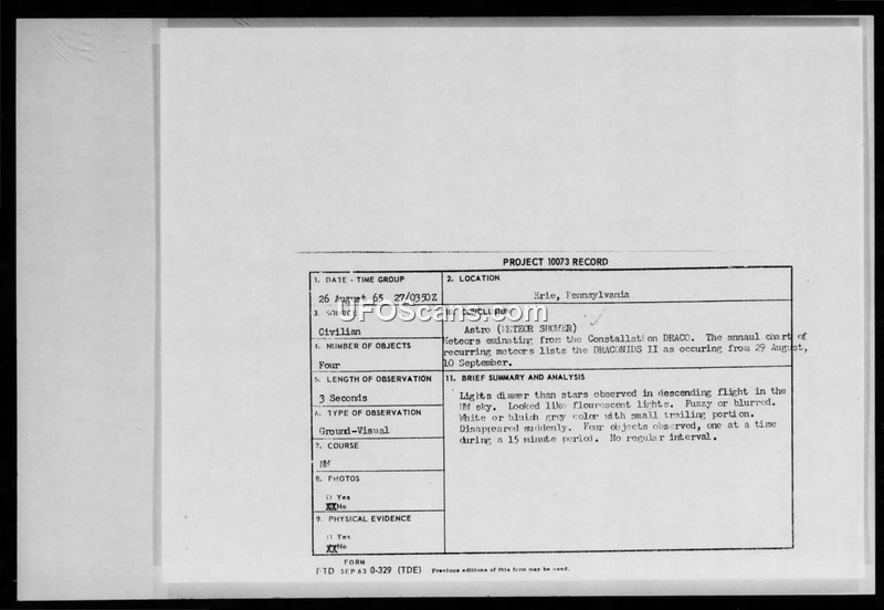 A civilian witness reported four unidentified objects in Erie, Pennsylvania, on August 26, 1965. The Air Force concluded the objects were meteors from the Draconids II shower.