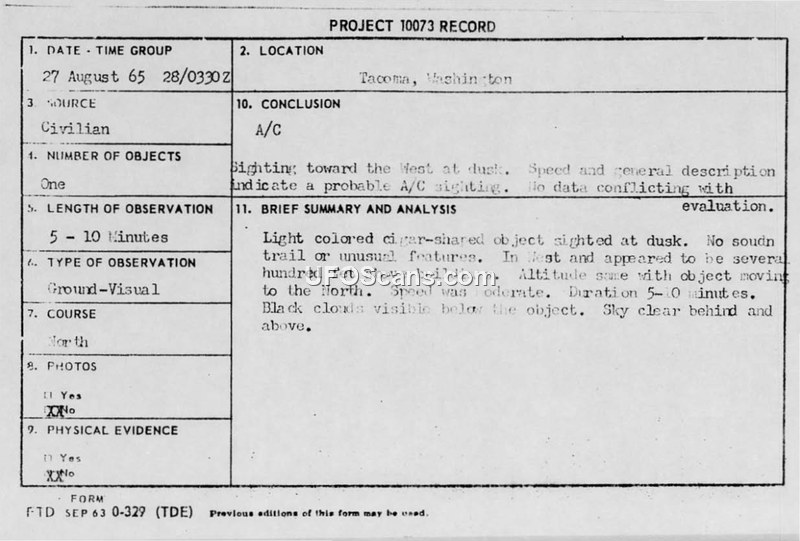 Project 10073 Record — Sighting Report, Tacoma, Washington, 27 August 1965