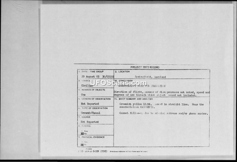 This document is a Project 10073 record concerning a UFO sighting reported on 29 August 1965 in Springfield, Maryland. The report, filed by a civilian witness, describes a single greenish-yellow light that moved in a straight line near the constellation Cassiopeia. The U.S. Air Force concluded that there was insufficient data for a formal evaluation. The record notes that the direction of flight, the manner of disappearance, the speed, and the degrees of arc through which the object passed were not provided. Furthermore, the Air Force was unable to conduct a follow-up investigation because the witness did not provide a contact address or phone number. A secondary note indicates that the report was received from a Headquarters Air Force duty officer and that no further information could be obtained.