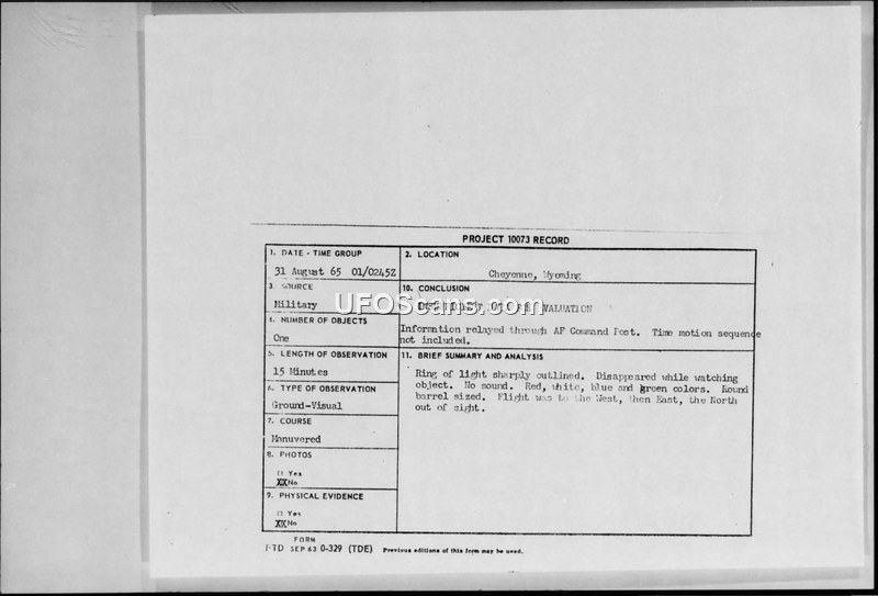 Project 10073 Record: Unidentified Flying Objects (UFO) - Cheyenne, Wyoming, August 1965