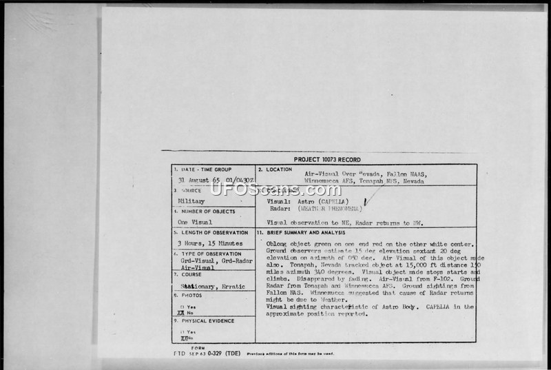 A 1965 UFO sighting in Nevada involving visual and radar observations was officially attributed to the star Capella and atmospheric weather phenomena. The report includes detailed military correspondence and technical data regarding the incident.