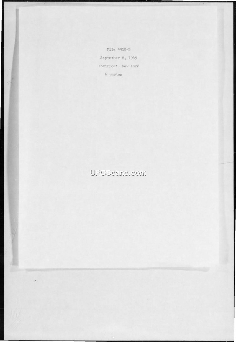 This document consists of a cover sheet and several pages of photographic evidence associated with File 9918-B. The file pertains to an event occurring on September 6, 1965, in Northport, New York. The documentation is marked as unclassified and originates from the Foreign Technology Division of the Air Force Systems Command (AFSC). The primary content of the file is a collection of six photographs, which are presented across the subsequent pages of the document. No narrative report, witness testimony, or analytical conclusion is provided within the provided pages; the document serves strictly as a record of the file and its associated photographic enclosures.