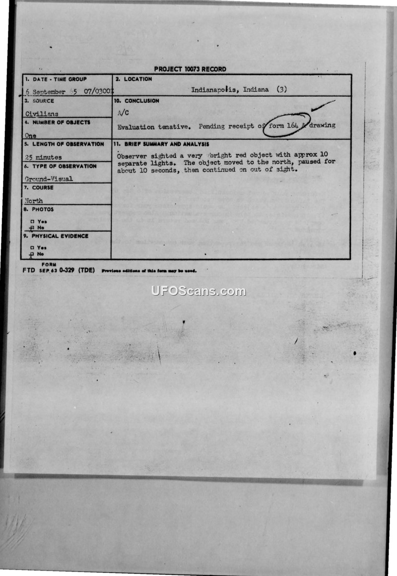 This document contains records from Project 10073 regarding unidentified aerial phenomena reported in Indianapolis, Indiana, during September 1965. The first incident, occurring on 6 September 1965, involved a civilian report of a bright red object with approximately 10 separate lights. The observer noted the object moved north, paused for 10 seconds, and then disappeared. This case was initially evaluated as an aircraft, pending further documentation. A subsequent series of reports occurred between 20 and 21 September 1965, involving a civilian witness who reported seeing lights similar to stars moving across the sky. Major Hector Quintanilla, Jr., Chief of Project Blue Book, investigated these reports and concluded they were artificial satellites. Major Quintanilla contacted the witness, who spoke broken English, and provided her with the schedules for the Echo and Pegasus satellites to explain the sightings. The witness was satisfied with this explanation. The file includes correspondence from Major Quintanilla requesting a drawing of the 6 September object, as well as a completed U.S. Air Force technical information questionnaire regarding that specific sighting.