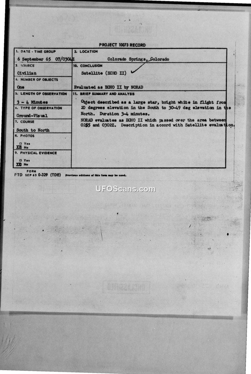 Project 10073 Record: Sighting Report - Colorado Springs, Colorado, 6 September 1965
