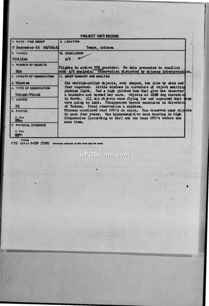 On 7 September 1965, a civilian witness in Tempe, Arizona, reported observing six oval-shaped, whitish-yellow objects. The witness, a liquor store clerk, described the objects as having 'little bitty windows' emitting a pinkish light and producing a high-pitched hum that caused her physical discomfort, specifically a headache and a burning sensation in her ears. The observation lasted approximately four minutes. According to the report, four of the objects disappeared below the crest of the Superstition Mountains, while two turned southeast, appearing to head toward Tucson. The witness claimed to have hypersensitive hearing, allowing her to detect the objects' high-frequency sounds before seeing them, and noted that her sister also possessed this ability. The Air Force investigation, conducted by the Foreign Technology Division, concluded that the sighting likely involved aircraft within an active VFR corridor. The report notes that the witness has a history of observing similar objects in the same area over the previous four years. Military authorities confirmed that no aircraft from Williams, Luke, or Davis-Monthan Air Force Bases were airborne in the area at the time. Phoenix Approach Control and the Albuquerque Center reported no radar contacts. The final assessment suggests that the sighting could have been two aircraft—one heading east and one heading west—and that the witness's interpretation was influenced by the difficulty of judging movement and depth at night.