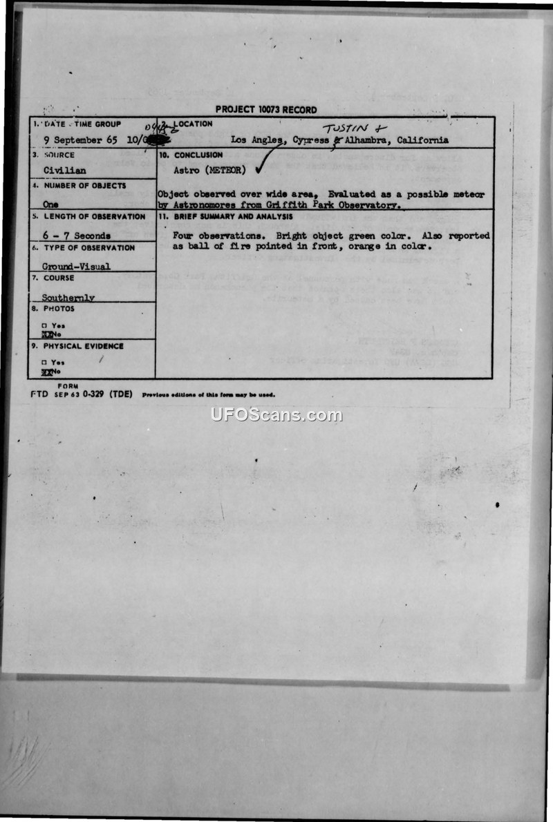 Project 10073 Record: Sighting Reports, 9 September 1965