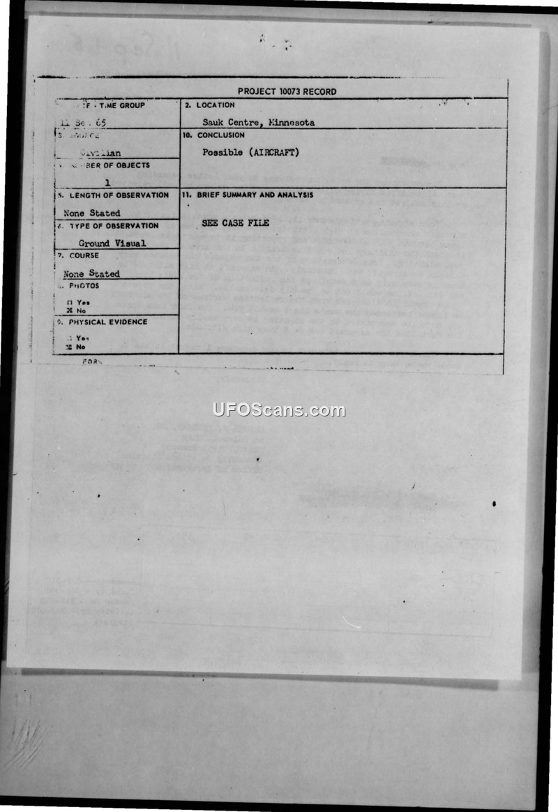 UFO Sighting, 11 September 1965 — Sauk Centre, Minnesota