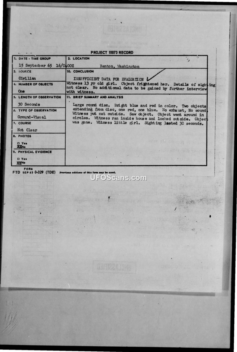 This document is a Project 10073 record detailing an Unidentified Aerial Phenomena sighting that occurred on September 15, 1965, in Renton, Washington. The report is based on the testimony of a 13-year-old female witness who observed the object while putting her cat outside. The witness described the object as a large, round, bright blue and red disc with two appendages extending from it—one red and one blue. The object reportedly moved in circles and descended in a curving path until it hovered approximately 25 feet above the ground. The witness noted that the object appeared to track her movements, as it moved to the right when she moved to the right, though it did not approach her. The witness became frightened and ran into her house; when she looked back out, the object was gone. The total duration of the sighting was 30 seconds. The report notes that there was no wind, no cloud cover, and the moon was visible. Military authorities at the 318th Fighter Interceptor Squadron at McChord Air Force Base investigated the incident, concluding that there was insufficient data for a formal evaluation and that no further information could be obtained from the witness. The report explicitly states there was no physical evidence, no radar contact, no interception action, and no other air traffic in the area at the time.