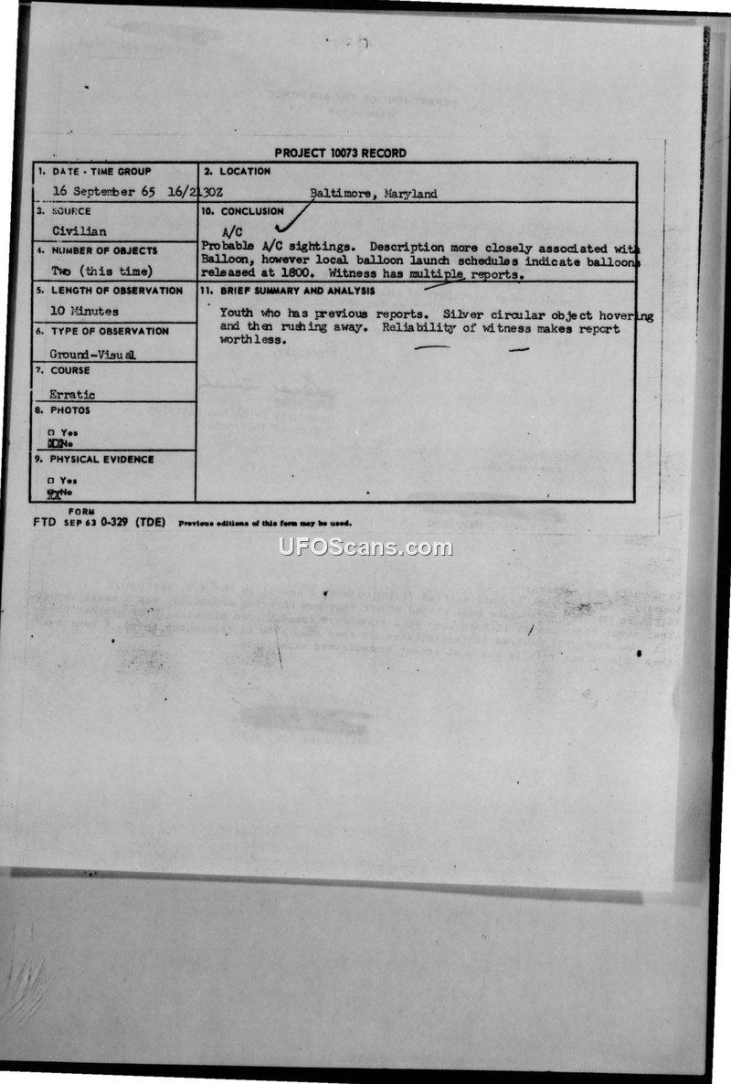 A 1965 Air Force sighting report from Baltimore, Maryland, involving a youth who reported two silver, oval-shaped objects. The Air Force concluded the report was likely an aircraft or balloon sighting and dismissed the witness's credibility.
