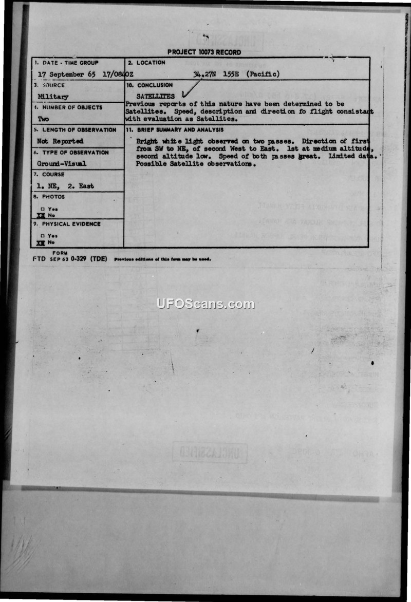 On 17 September 1965, a sighting of two unidentified flying objects was reported in the Pacific region at coordinates 34.27N 155E. The incident was documented through military message traffic originating from the 326 Air Division at Kunia Facility, Hawaii, and addressed to various commands including Hickam AFB, Pearl Harbor, and Wright-Patterson AFB. The objects were described as bright white lights observed during two separate passes. The first pass occurred from the southwest to the northeast at a medium altitude, while the second pass occurred from the west to the east at a low altitude. The motion of the objects was noted as appearing erratic during the second pass, and the speed for both passes was described as great. The official conclusion reached by the evaluating agency, FTD, was that the objects were satellites, noting that their speed, description, and flight direction were consistent with previous reports of satellite observations.