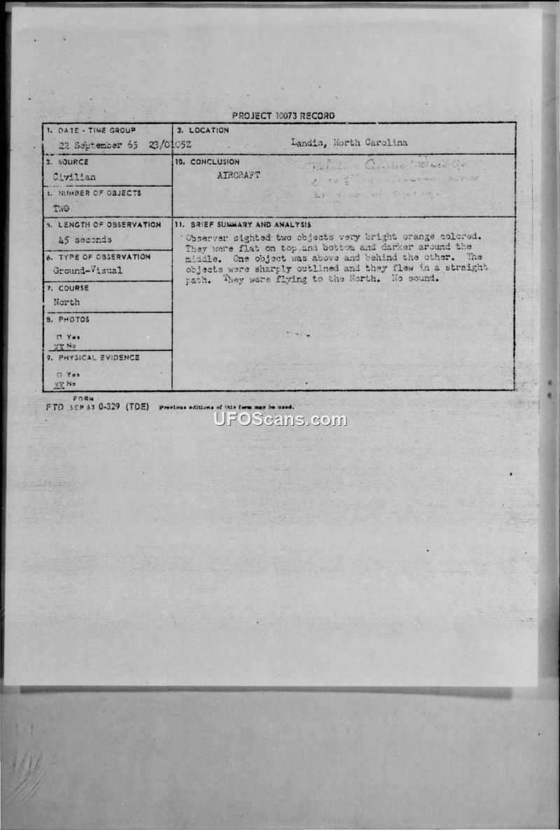 A civilian reported two bright orange objects in Landis, NC, in 1965. The Air Force officially identified these as aircraft involved in a refueling operation in the 'Black Cov' corridor, a conclusion the witness rejected.