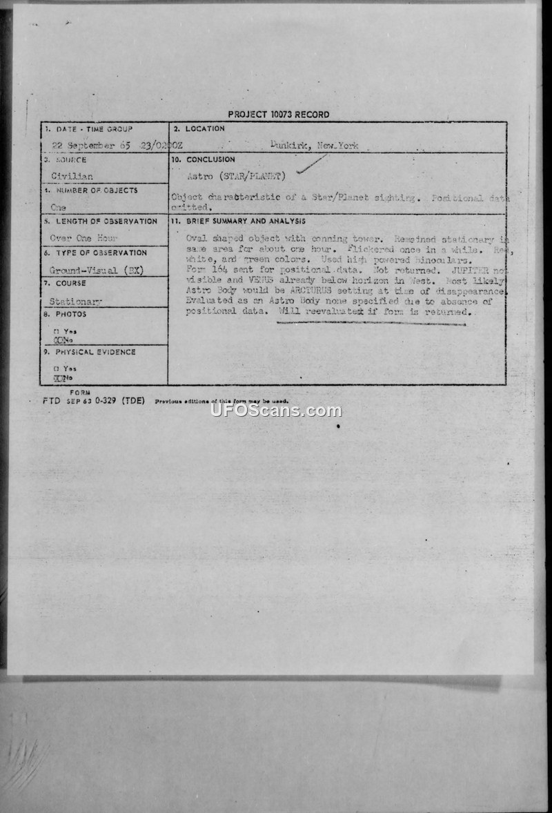PROJECT 10073 RECORD — Dunkirk, New York, 22 September 1965