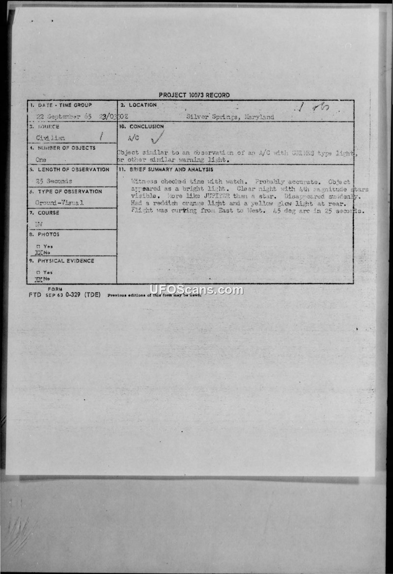 A civilian in Silver Spring, Maryland, reported a bright, curved-path aerial object on September 22, 1965. The Air Force concluded the object was likely an aircraft with a warning light.