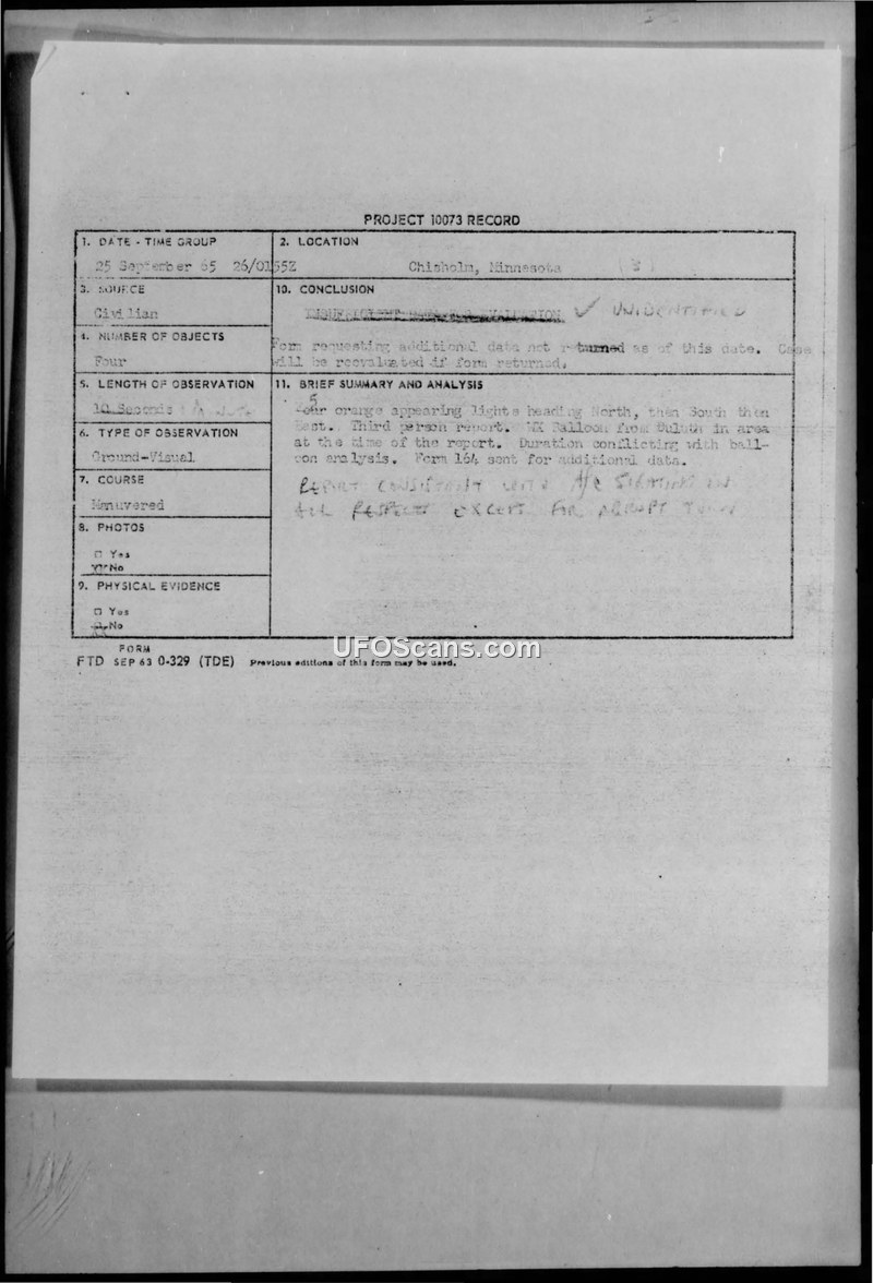 A civilian in Chisholm, Minnesota, reported five orange, silent, high-speed objects on 25 September 1965. Despite investigation, the case remained classified as unidentified due to conflicting data regarding weather balloons and the witness's description of the objects' flight characteristics.