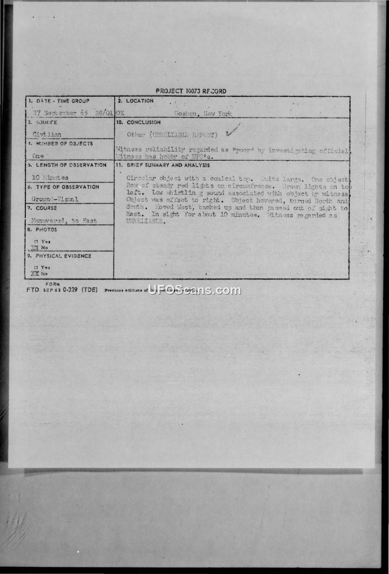 A 1965 Air Force report documents a civilian UFO sighting in Goshen, New York. The report was officially classified as an 'unreliable report' due to the witness's background and interest in UFOs.