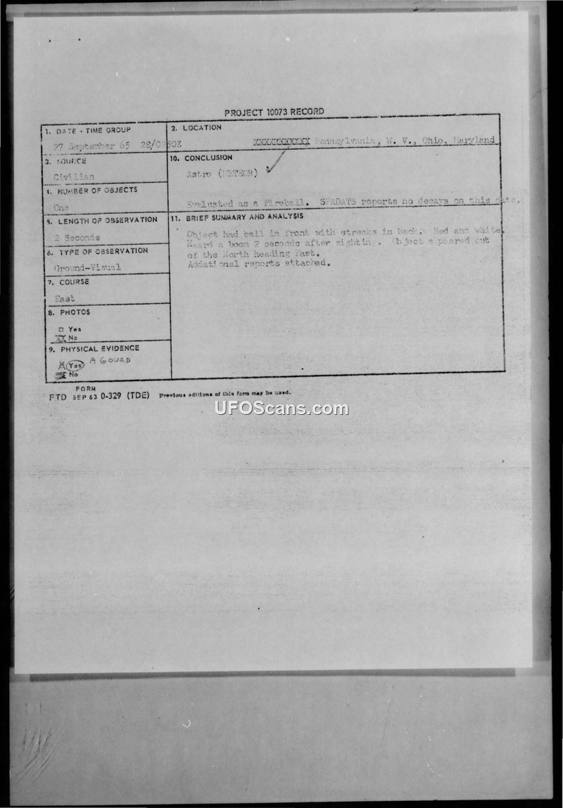 A civilian reported a fireball sighting on 27 September 1965. The official investigation concluded it was a meteor, and the physical evidence submitted by the witness was identified as a gourd.