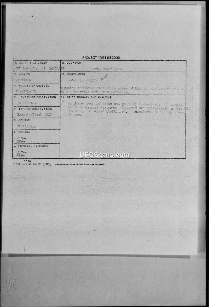 A 1965 UFO sighting in Kent, Washington, was investigated by the 318th FIS and officially identified as the star Capella. The witness observed the object for 30 minutes using binoculars.