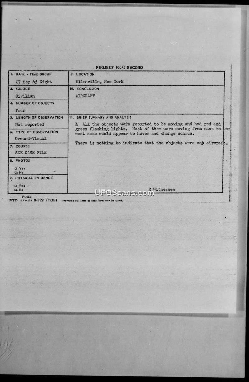 A 1965 sighting report from Ellenville, New York, involving four objects with flashing lights. The official military conclusion identified the objects as aircraft.