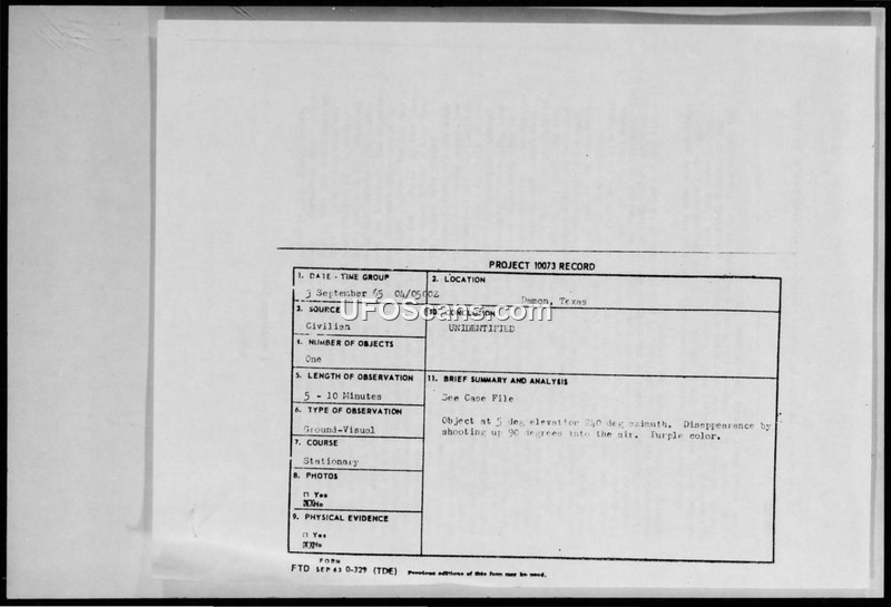 Project 10073 Record: UFO Sighting, Damon, Texas, 3 September 1965