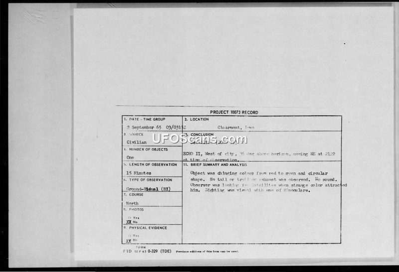 PROJECT 10073 RECORD: Sighting Report - Clearment, Iowa, 2 September 1965