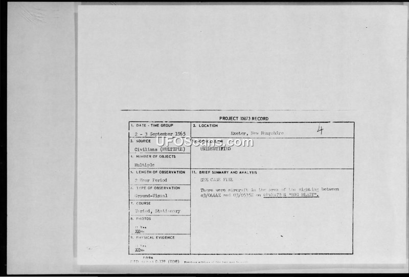 Project 10073 Record: Exeter, New Hampshire Sighting (September 1965)