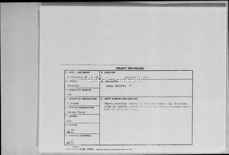 This document collection contains correspondence and a Project 10073 record regarding UFO sightings reported by a civilian in September 1965. The witness, writing from Tampa, Florida, initially reported a sighting on September 3, 1965, which was recorded as a 'meteor' in the Project 10073 record. In subsequent letters, the witness described additional sightings on September 4 and 6, 1965, involving objects that exhibited complex flight patterns, including hovering, turning in circles, and making ninety-degree turns. The witness expressed skepticism regarding the Air Force's handling of UFO information and requested further sources, noting that they had read books by Donald Keyhoe. The Air Force, through the Foreign Technology Division and the Office of Information, responded by identifying the objects sighted on September 4 and 6 as the Echo II satellite. They explained the perceived erratic movement as a common visual illusion occurring when the satellite passed near stars. The Air Force also provided the witness with FTD Form 164 for future reporting and a copy of the Project Blue Book report, while simultaneously dismissing the works of Donald Keyhoe as science fiction.