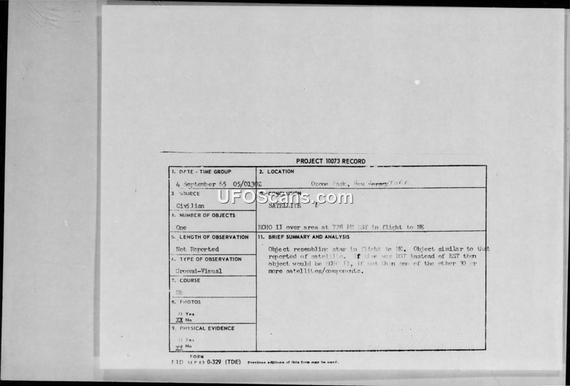 A 14-year-old student reported a triangular, bright white object in the sky over Ozone Park, NY, on September 4, 1965. The Air Force investigated the report under Project 10073 and concluded the object was likely the Echo II satellite.
