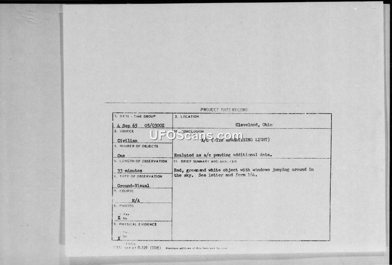 A civilian witness in Cleveland reported a 33-minute sighting of a complex, maneuvering aerial object on September 4, 1965. Project Blue Book investigators officially concluded the object was likely an advertising aircraft.