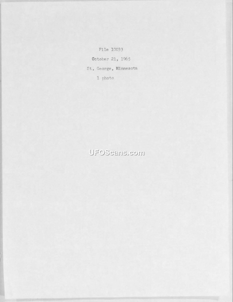 This document, identified as File 10033, pertains to an unidentified aerial phenomenon sighting reported on October 21, 1965, in St. George, Minnesota. The file consists of a brief cover page and a single photograph. The document is marked as unclassified and was processed by the Foreign Technology Division of the Air Force Systems Command (AFSC). No further descriptive details regarding the nature of the object, the circumstances of the sighting, or any investigative findings are provided within the text of the document.