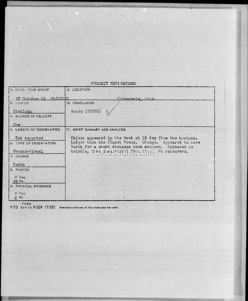 On October 27, 1965, at 9:10 P.M., a witness in Cloverdale, Ohio, observed an unidentified flying object. The witness reported that the object appeared in the west at approximately 15 degrees above the horizon. It was described as being larger than the planet Venus and orange in color. The object moved north for a short distance before stopping, appeared to twinkle, and then disappeared from view. The witness explicitly noted that the object did not move up, down, or sideways. Following the report, the Air Force investigated the incident under Project 10073. Major H. Quintanilla, Jr., of the TDEW/UFO office, concluded that the sighting was likely caused by the planet Venus, which was in the process of setting at the time. The assessment noted that Venus had a right ascension of 17 hours and 12 minutes and a stellar magnitude of -3.9, placing it near the horizon at 240 degrees azimuth. The correspondence also addressed the witness's inquiry regarding the Air Force Museum and the existence of unidentified flying objects, stating that no physical evidence exists to support the contention that such objects are interplanetary vehicles.