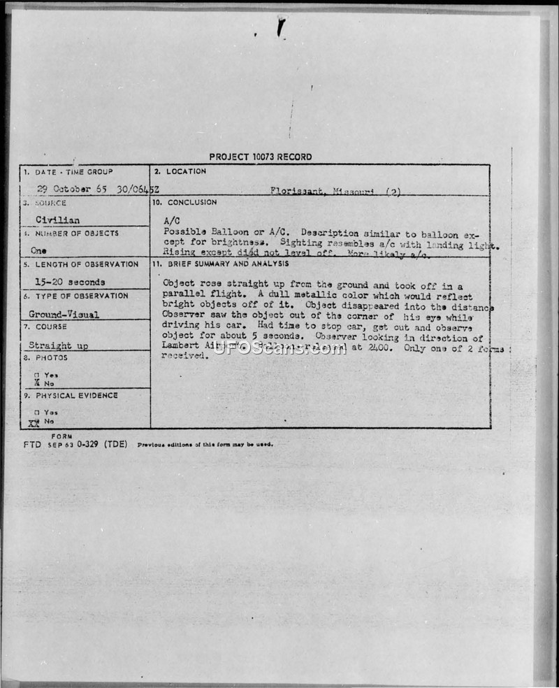 This document contains the Project 10073 record regarding an unidentified aerial phenomenon reported by a 20-year-old civilian male in Florissant, Missouri, on October 30, 1965. The witness, while driving his car at the intersection of Douglas Road and Jamestown Road, observed a round, dull metallic disc with a slight dome rising from a woodland area at an estimated altitude of 1500 feet. The witness stopped his vehicle, exited, and observed the object for approximately 15 to 20 seconds. He described the object as rising straight up, performing a parallel flight, and then departing at a high rate of speed toward the northeast. The witness estimated the object's size to be approximately 100 feet across and noted that it made no sound. The night was clear with no moonlight and 3/10 cloud cover. The witness reported the incident to the Florissant Police Department and the St. Louis County Police. Major Hector Quintanilla, Jr., Chief of Project Blue Book, subsequently contacted the witness and the St. Louis County Police, requesting further information via Form 164. The official conclusion reached by the Air Force was that the object was likely an aircraft or possibly a balloon, noting that while the description was similar to a balloon, the brightness and flight characteristics were more indicative of an aircraft.