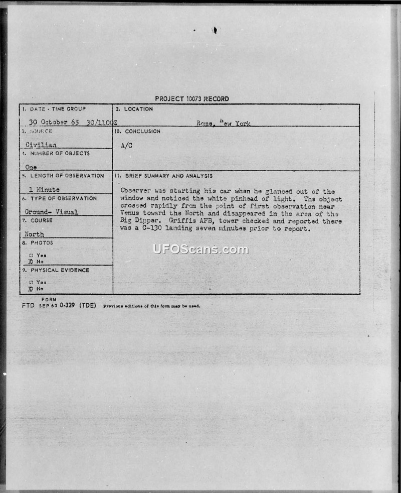 Project 10073 Record: Sighting in Rome, New York, 30 October 1965
