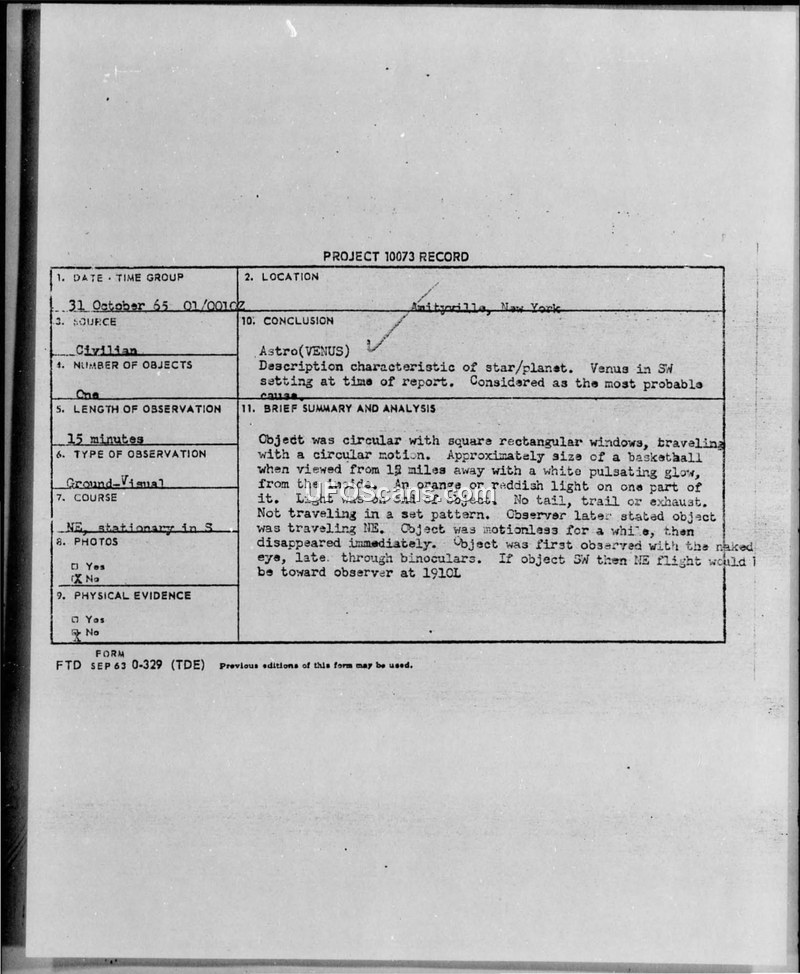 A UFO sighting report from Amityville, NY, on November 1, 1965, was officially identified by the Air Force as the planet Venus.