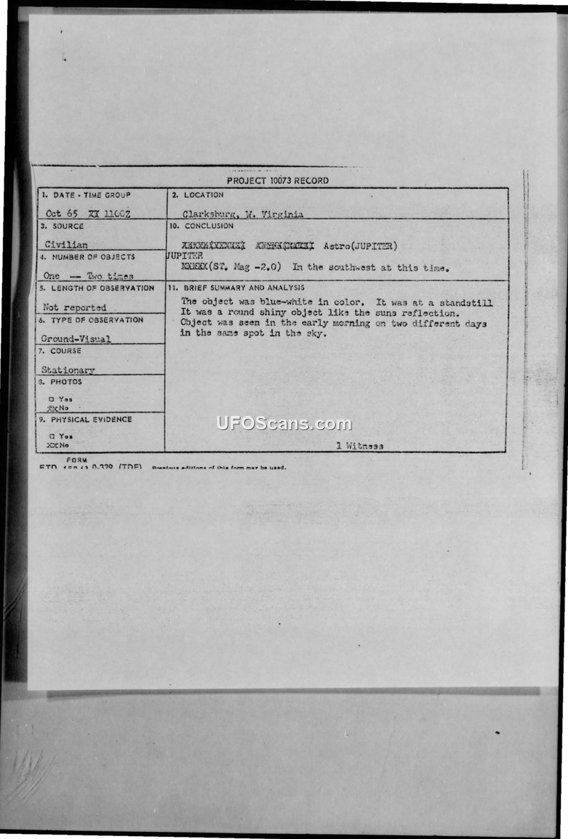 A civilian report of a UFO sighting in Clarksburg, West Virginia, in October 1965 was investigated under Project 10073. The official conclusion determined the object was the planet Jupiter.