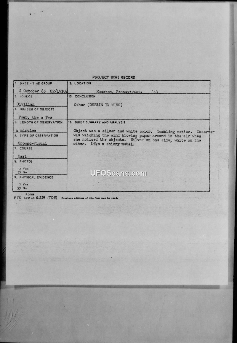 Project 10073 Record — Houston, Pennsylvania, 2 October 1965