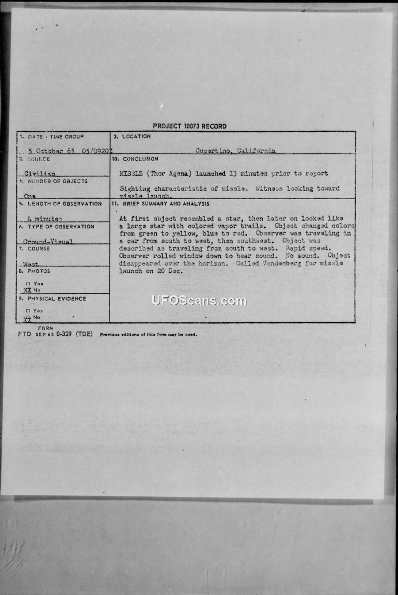 Project 10073 Record — Sighting in Cupertino, California, 5 October 1965