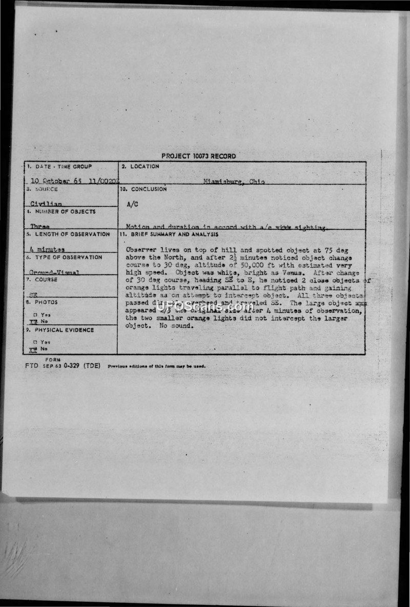 Project 10073 Record — Miamisburg, Ohio, 28 October 1965