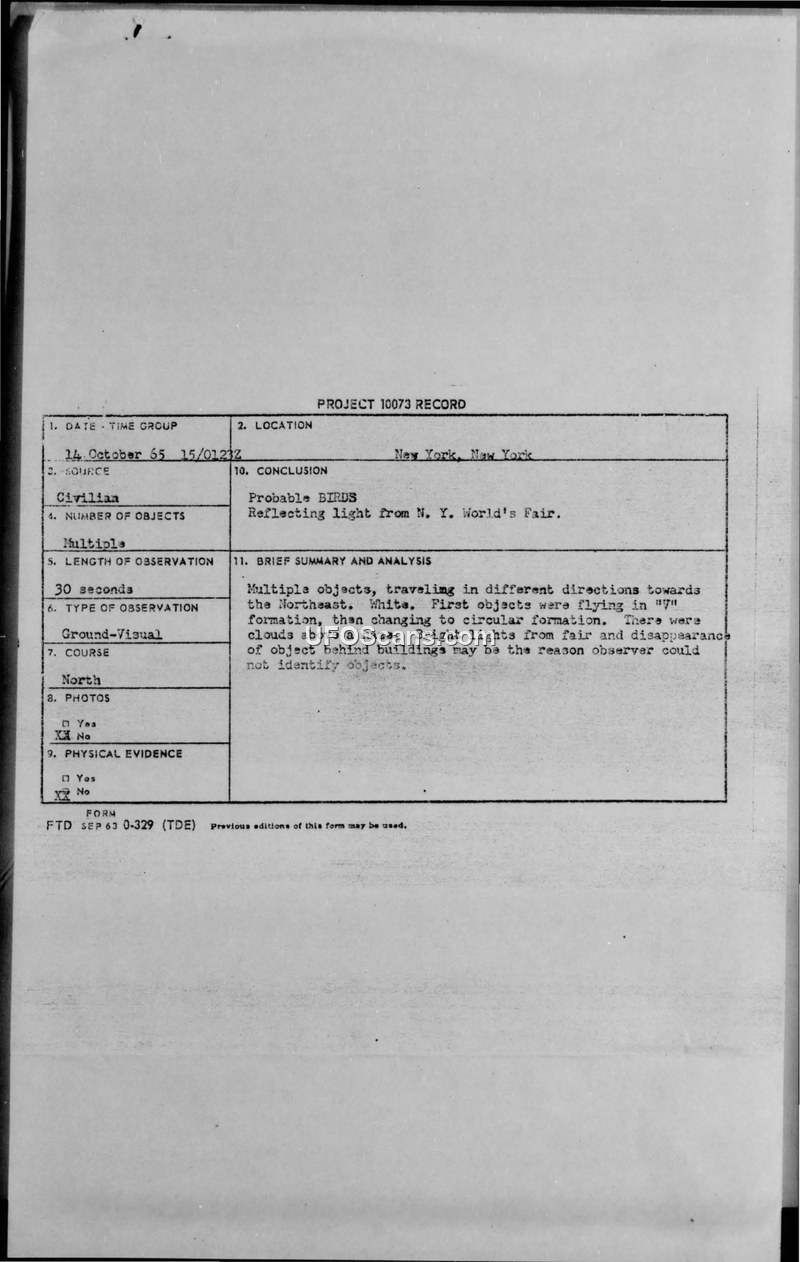 Project 10073 Record: Sighting at New York World's Fair, October 1965